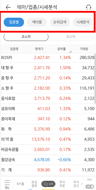 이렇게 테마/업종/시세분석을 클릭하면 업종별 섹터별 분류를 보실수 있습니다.