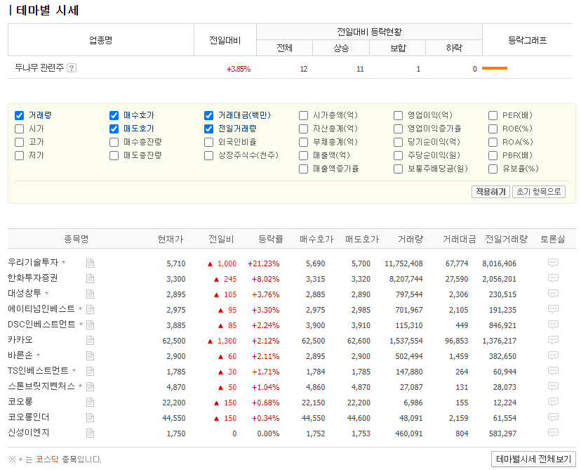 위의 증권사 어플과의 비교를 위해 같은 관련주를 클릭해보면 종목이 다르지 않음을 알수가 있습니다.